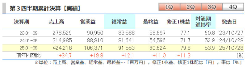 ↑ 3Qまでの業績を 過去比較ですが「売上・経常」ともにしっかり伸びています!