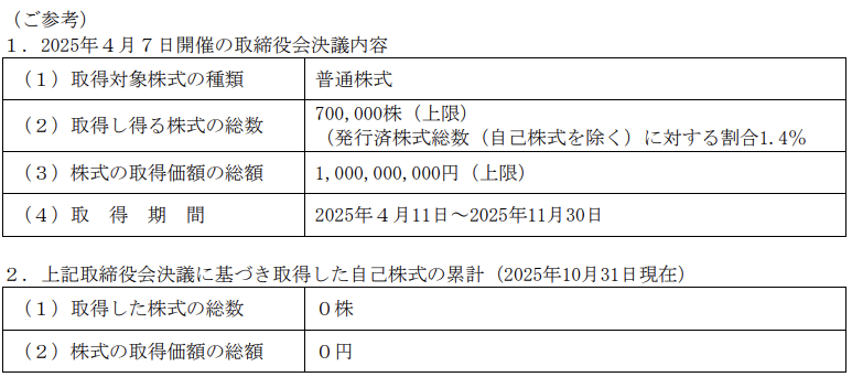 ※ ↑期限は今月(11月)末までなので、今後に株価が下落するようなことがあれば自己株買いが期待できる状況です。