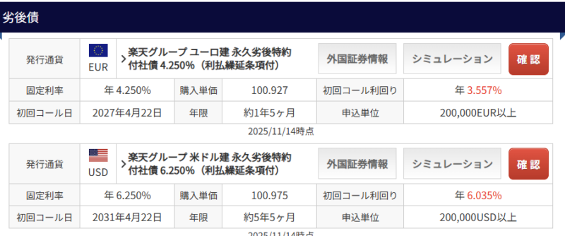 ↓現在(2025年11月時点)の楽天Gの債券利回りです。