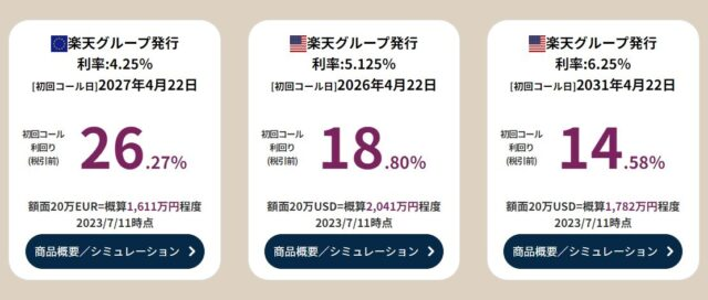 ↓ 2023年7月時点の楽天Gの債券利回りです。