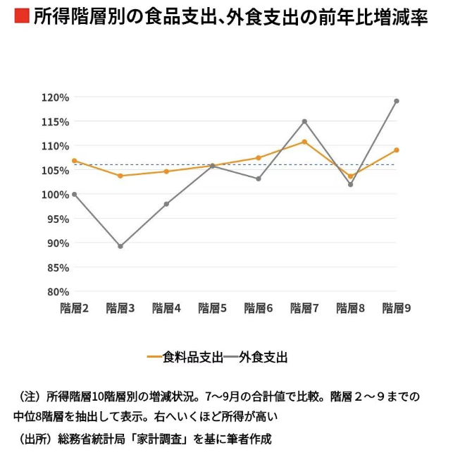 食品全体ではおおむね物価上昇率(青い点線、約7%)と同じくらい増えていて所得階層による違いはあまりないが、外食に関しては所得の少ない層ほど節約していて、高い層では逆に増やしているという傾向が見て取れると思う。