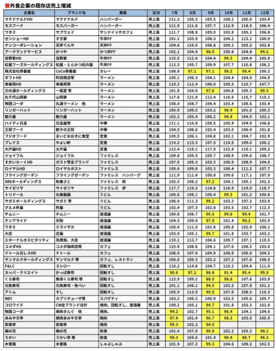 次に目につくのは、これまで好調に推移していたラーメン業態である。ラーメンは単価千円の壁を越えたと言われていたが、ここにきて節約モードの層の一部離脱とみられる動きもみえる。