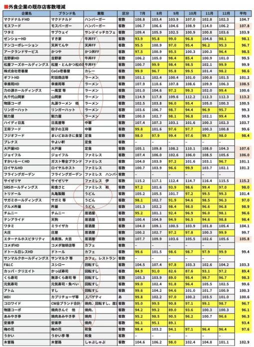 そんな中でも好調に客数を増やしている企業に朱色で網掛けしてある。モスフードサービス、幸楽苑、丸千代山岡家、大戸屋、ジョイフル、サイゼリヤ、エターナルホスピタリティ(鳥貴族)は、こんなご時勢でも平均で+5%以上客数を増やしている。