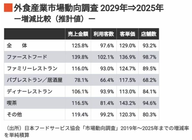 上表の項目で「店舗数」の増減を見ると、居酒屋の減少が激しいですね。