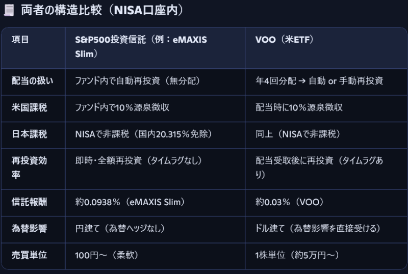 - 信託報酬の差:VOO(0.03%)はS&P500投信(0.0938%)より低く、長期で効いてくる。