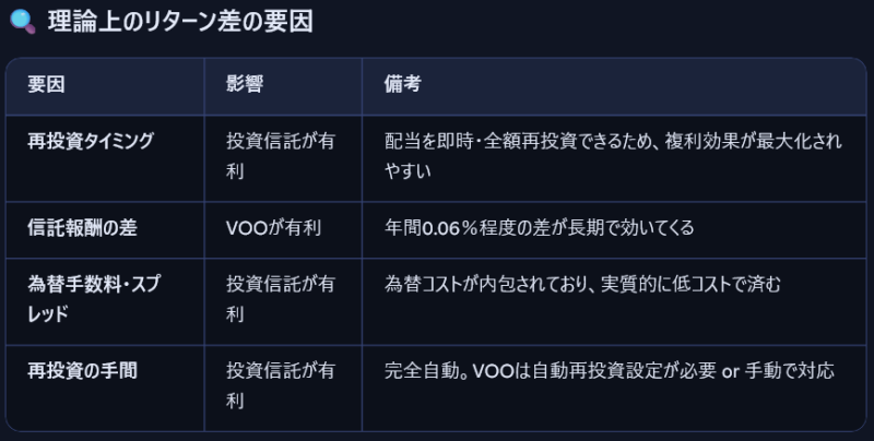 - 再投資タイミング:投資信託は即時再投資、VOOは四半期ごと。タイムラグの影響は軽微。