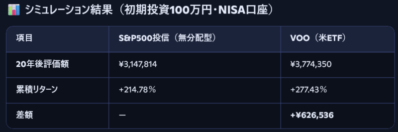 - 配当再投資効果:VOOは年1.35%(税引後)を年4回再投資。複利効果が大きく、20年で約10%以上の差に。